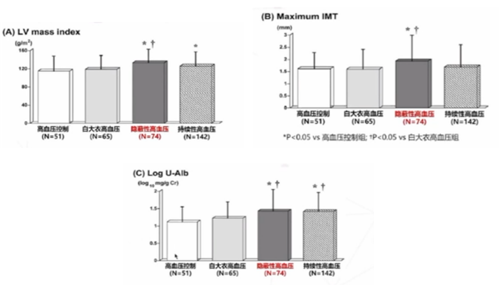 隱蔽性高血壓與靶器官損傷相關(guān),且損傷水平與持續(xù)性高血壓相似,一項(xiàng)納入332例平均接受降壓藥物治療13年的門(mén)診高血壓患者的觀察性研究顯示,隱蔽性高血壓患者的左室質(zhì)量指數(shù)(LVMI)、頸動(dòng)脈超聲測(cè)量頸動(dòng)脈最大內(nèi)膜-中膜厚度(IMT)、生化檢查尿微量白蛋白(U-ALb)均明顯高于高血壓控制組和白大衣高血壓組。(圖1)。