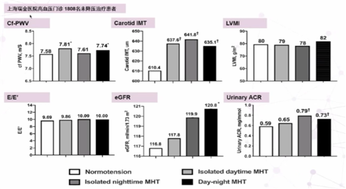 上海瑞金醫(yī)院對(duì)高血壓門(mén)診1808名未接受降壓治療患者進(jìn)行研究,對(duì)不同隱蔽性高血壓亞型進(jìn)行探索,結(jié)果發(fā)現(xiàn),無(wú)論是何種隱蔽性高血壓患者(白天血壓增高、夜間血壓增高、白天和夜間血壓均增高)都會(huì)出現(xiàn)不同程度的腎臟、血管等靶器官損傷(圖2)。