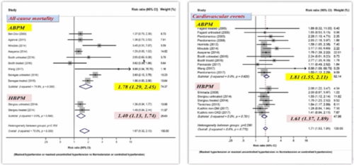 近期瑞金醫(yī)院結(jié)合21項(xiàng)研究探討由家庭或動(dòng)態(tài)血壓監(jiān)測(cè)診斷的隱蔽性高血壓患者的心血管風(fēng)險(xiǎn),結(jié)果發(fā)現(xiàn)無(wú)論是由家庭血壓監(jiān)測(cè)診斷的隱蔽性高血壓患者,還是由動(dòng)態(tài)血壓監(jiān)測(cè)診斷的隱蔽性高血壓患者,其心血管事件以及全因死亡風(fēng)險(xiǎn)均顯著增高,且增幅均為40%-80%(圖4)。